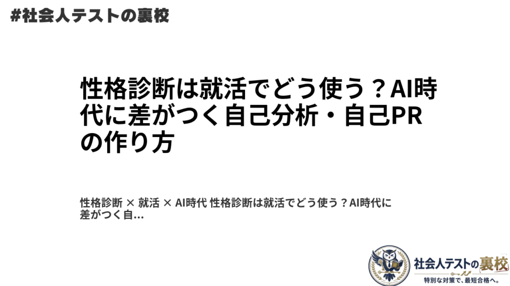 性格診断 × 就活 × AI時代 性格診断は就活でどう使う?AI時代に差がつく自己分析・自己PRの作り方 就活で自己分析に悩んだとき、性格診断を使う人はかなり増えています。ですが最近は、そこにAIまで加わり、自己PRやESを整えること自体は以前よりずっと簡... -