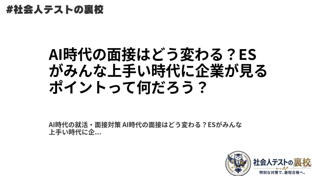 AI時代の就活・面接対策 AI時代の面接はどう変わる?ESがみんな上手い時代に企業が見るポイント AIで自己PRやESを整える人が増えると、書類だけでは差がつきにくくなります。文章がきれいで、言いたいこともまとまっている。そんな応募者が当たり前になる... -