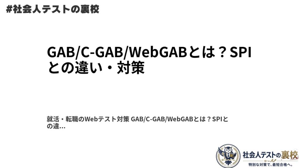 就活・転職のWebテスト対策 GAB/C-GAB/WebGABとは?SPIとの違い・対策 GAB系の違い、SPIとの違い、対策の優先順位をわかりやすく整理しました。 この記事の結論 GABはSPIとは別系統の適性検査 C-GABはテストセンター系、WebGABはWeb受検系と考えると整理し...