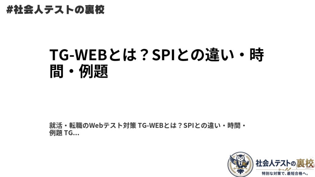 就活・転職のWebテスト対策 TG-WEBとは?SPIとの違い・時間・例題 TG-WEBの特徴、SPIとの違い、時間の考え方、対策の優先順位をわかりやすく整理しました。 この記事の結論 TG-WEBは、SPIとは別系統の適性検査 企業によって出題セットや検査時間が異なる S... -