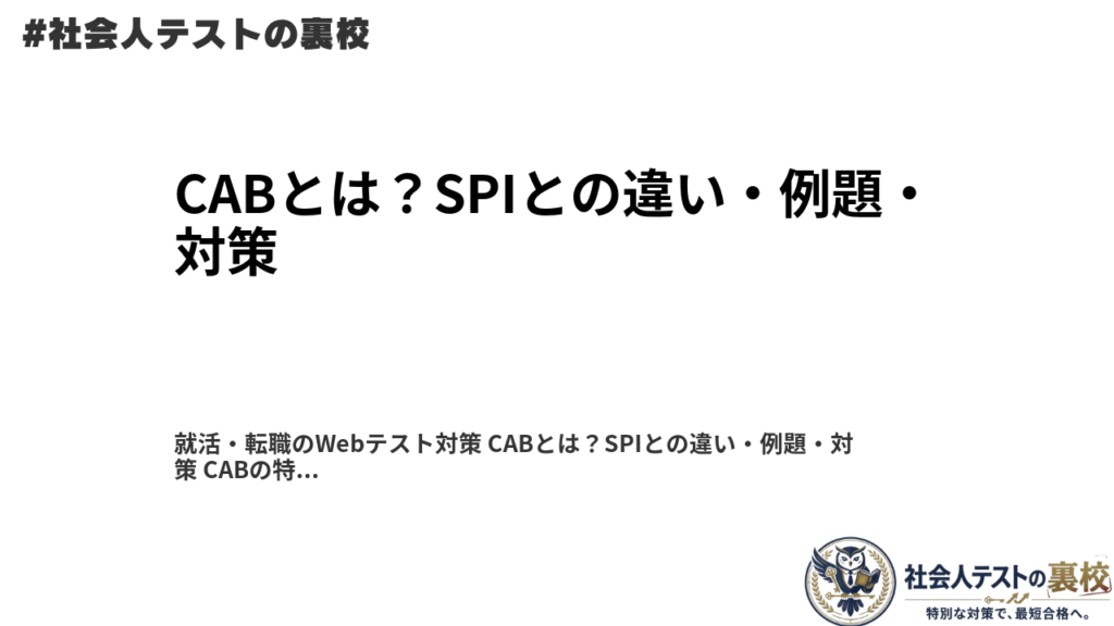 就活・転職のWebテスト対策 CABとは?SPIとの違い・例題・対策 CABの特徴、SPIとの違い、よく出る問題、対策の考え方をわかりやすく整理しました。 この記事の結論 CABは、SPIとは別系統の適性検査 IT・デジタル人材向けの適性を見られやすい SPIよりも法... -