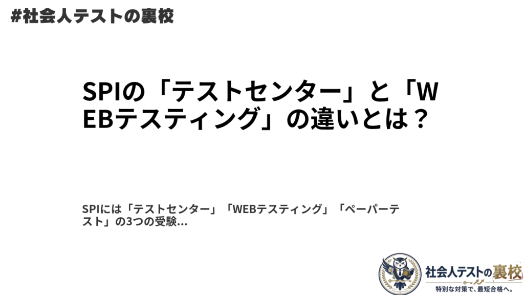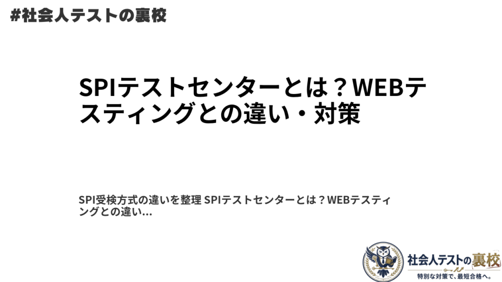 SPI受検方式の違いを整理 SPIテストセンターとは?WEBテスティングとの違い・対策 SPIテストセンターの仕組み、WEBテスティングとの違い、対策の優先順位をわかりやすく整理しました。 この記事の結論 テストセンターは、監督付きで受けるSPIの方式 WEBテ... -