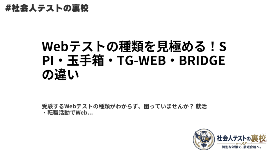 受験するWebテストの種類がわからず、困っていませんか? 就活・転職活動でWebテストの案内が届いたとき、受験するテストの種類が分からないまま対策を進めてしまうケースは少なくありません。テストの種類によって出題形式や対策方法は大きく異なるため、... -